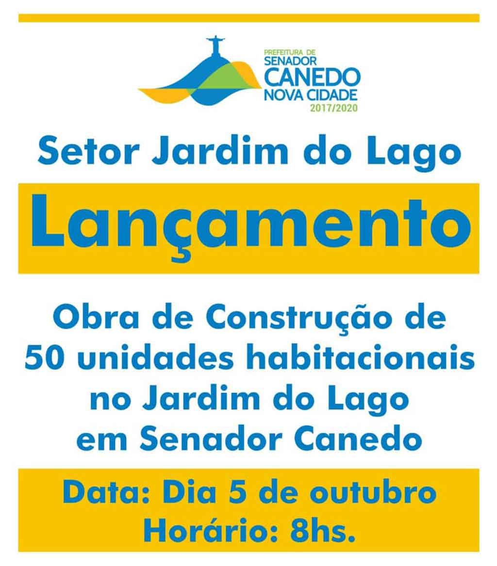 A Prefeitura de Senador Canedo, por meio da Secretaria Municipal de Assistência Social e Cidadania, convida para o lançamento da obra de 50 unidades habitacionais no Jardim do Lago. Arte Secom[/caption]