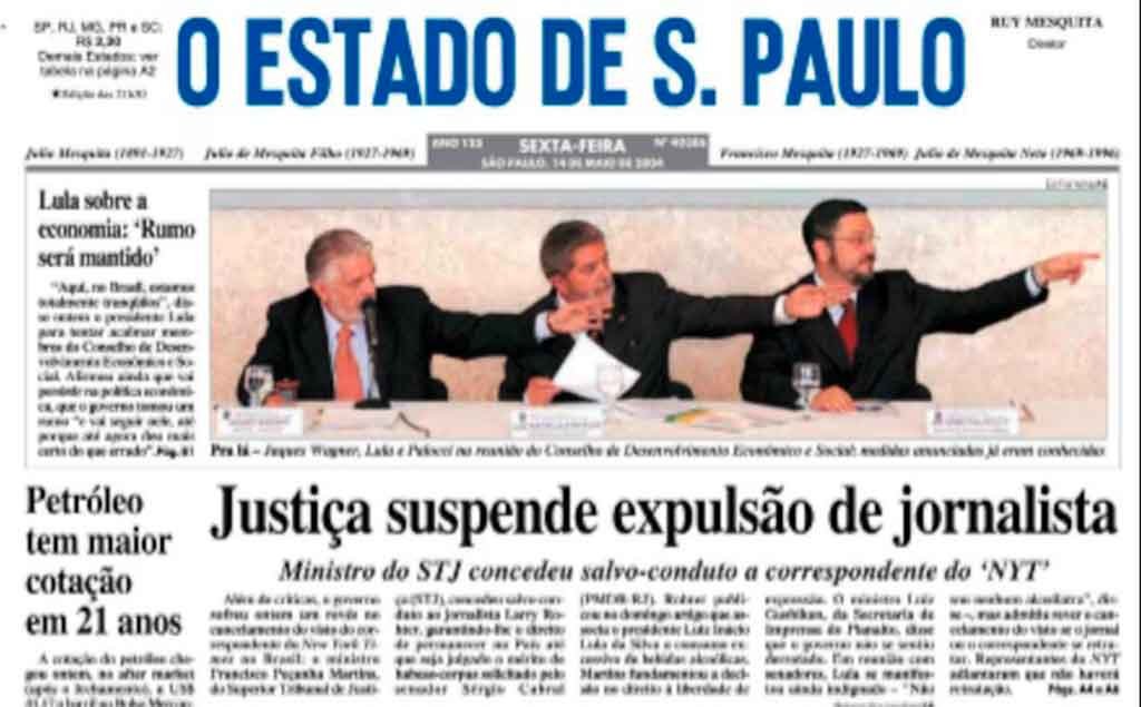 Primeira página do Estadão em maio de 2004 quando STJ barrou tentativa do governo Lula de expulsar jornalista do NYT Foto: Reprodução / Estadão[/caption]