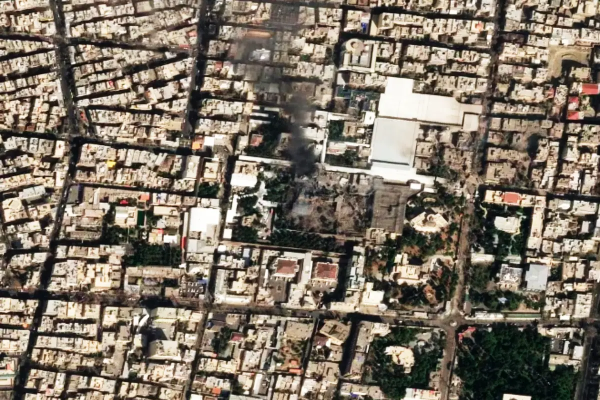 Os registros revelam uma coluna negra de fumaça, edifícios colapsados e danos estruturais graves.