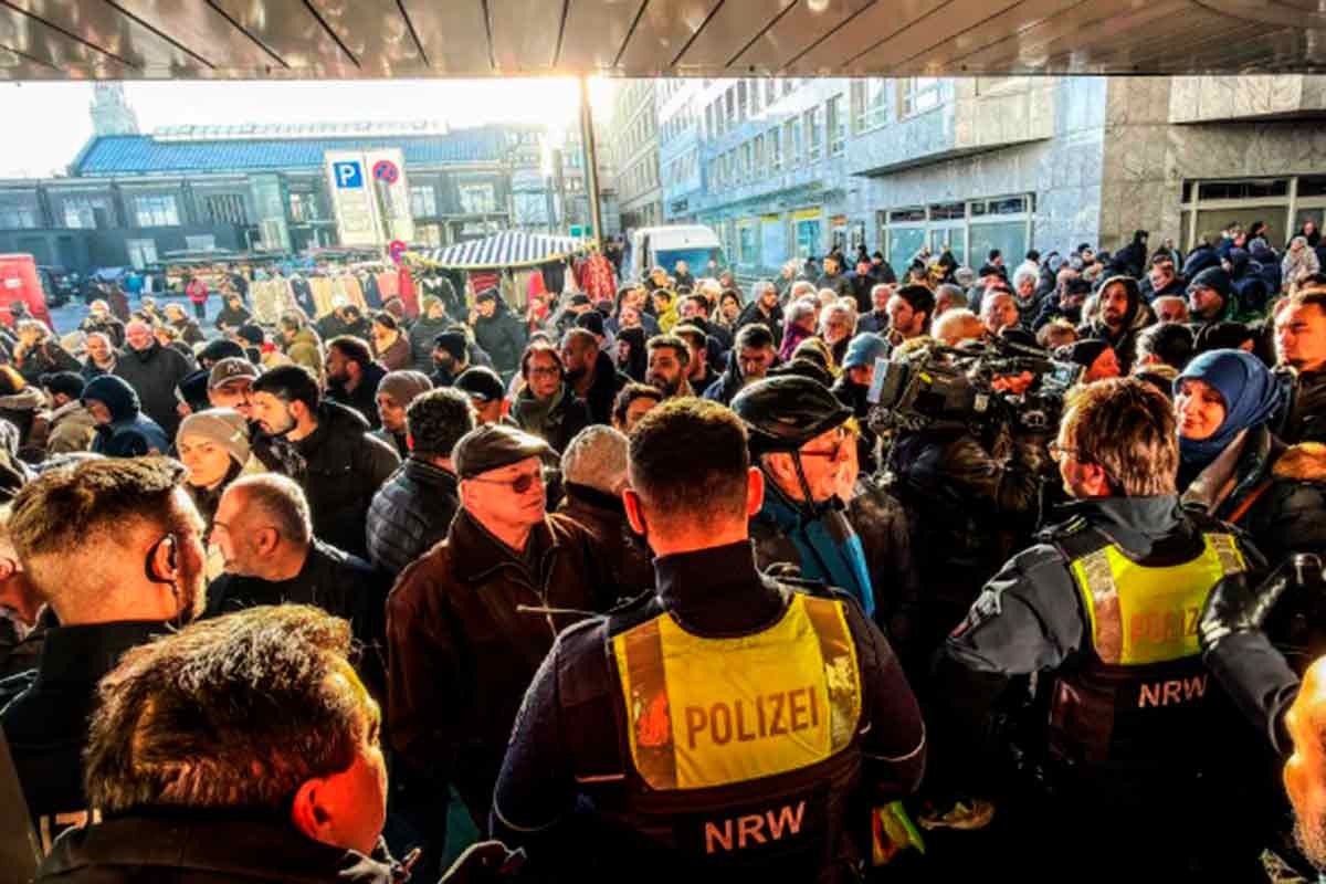 Em um vídeo publicado pelo jornal alemão Bild, dezenas de pessoas tentaram forçar a entrada no edifício apesar da presença policial.