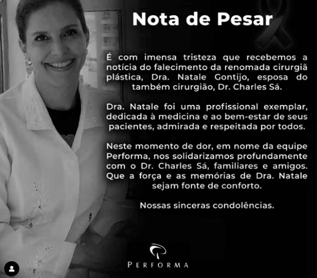 Neste momento de dor, em nome da equipe Performa, nos solidarizamos profundamente com o Dr. Charles Sá e com todos os familiares e amigos. (…)