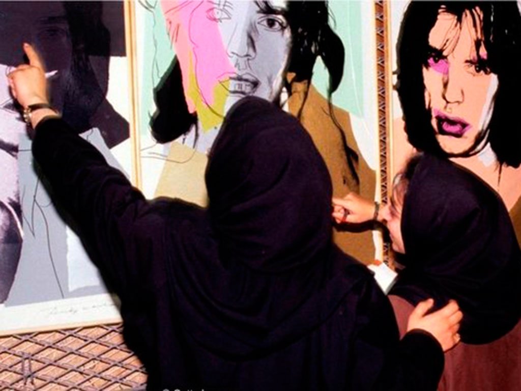 Duas funcionárias do Museu de Arte Contemporânea de Teerã (TMoCA) examinam retratos de Mick Jagger, de Andy Warhol, nos cofres do museu em 1993 Getty Images[/caption]