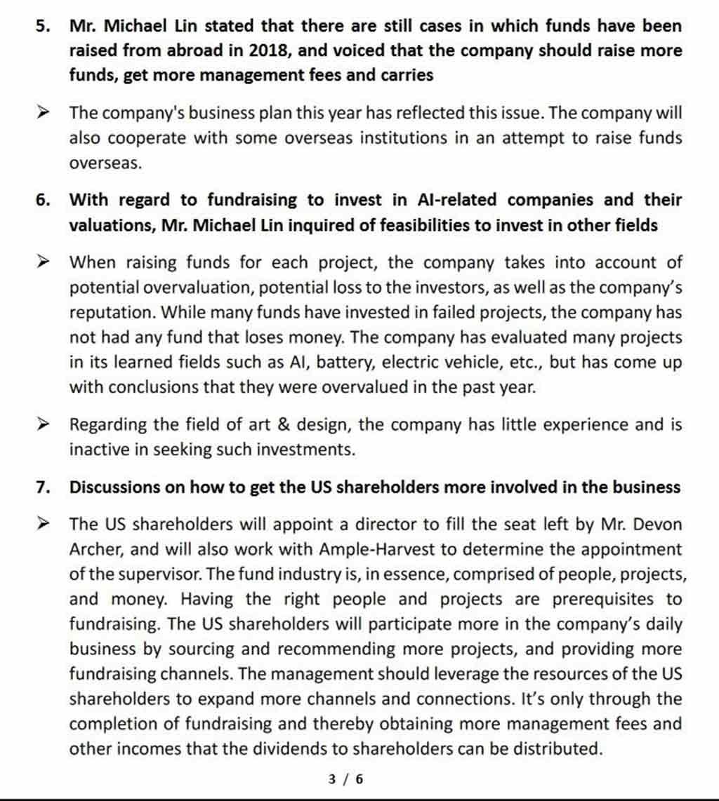 Também sabemos por documentos identificados na Cartilha Ilustrada de Yaacov Apelbaum , que a BHR realizou uma reunião do Conselho em março de 2019, onde discutiu não apenas os investimentos, mas uma decisão estratégica para garantir que suas ações estivessem alinhadas com as do governo chinês. Incluídas estavam as atas da reunião de janeiro de 2019, em que Hunter Biden ouviu o Conselho discutir sobre o investimento da empresa chinesa em empresas relacionadas à IA e outros empreendimentos estrangeiros. Por minutos: