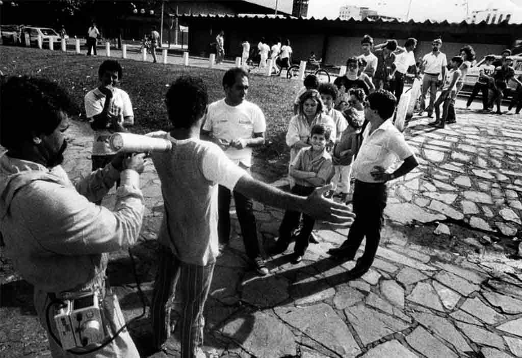Brasil, Goiânia, GO. 02/10/1987. Técnico da CNEN (Comissão Nacional de Energia Nuclear) mede índice de radioatividade em pessoas contaminadas durante o acidente radiológico com Césio-137, no Estádio Olímpico em Goiânia, Goiás. / CARLOS COSTA/O POPULAR/AE/Codigo imagem:42624[/caption]
