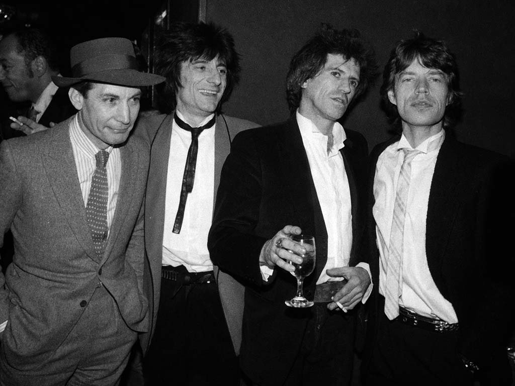 Charlie Watts, Ron Wood, Keith Richards e Mick Jagger, membros do Rolling Stones, aparecem na festa da estreia do filme "Vamos passar a noite juntos", em Nova York, em 18 de janeiro de 1983 — Foto: AP Photo/Carlos Rene Perez, File[/caption]