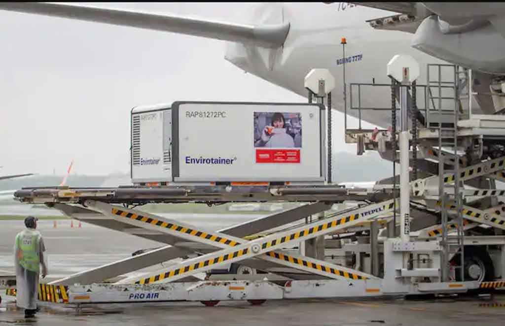 Um contêiner refrigerado contendo a vacina contra o Sinovac contra o coronavírus sai de um avião de carga em 19 de novembro em São Paulo, Brasil. A empresa chinesa está procurando fornecer sua vacina em todo o mundo em desenvolvimento. (Jonne Roriz / Bloomberg News)[/caption]