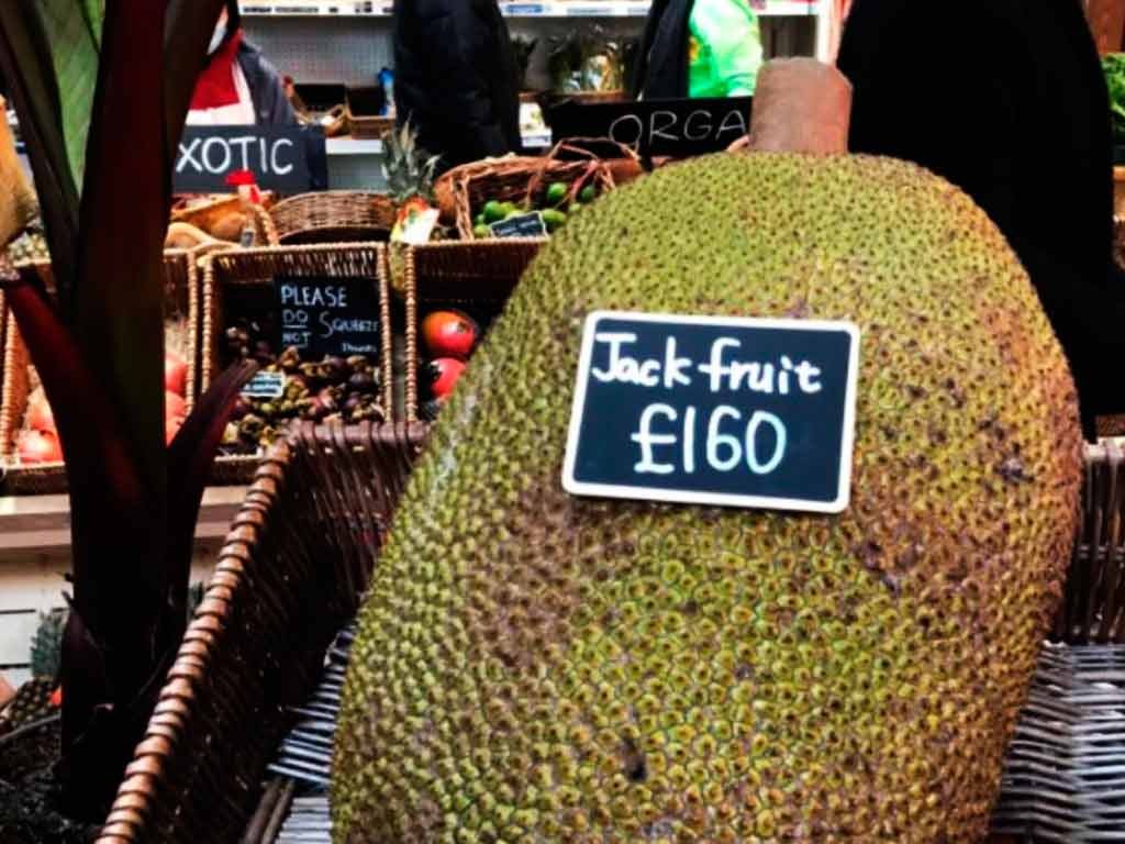 A fruta estava disponível em uma barraca do Borough Market, um dos mercados mais famosos de Londres.O alto valor chocou muitos usuários, considerando que a jaca é vendida a menos de R$ 5 no Brasil (Crédito: Reprodução / Twitter)[/caption]