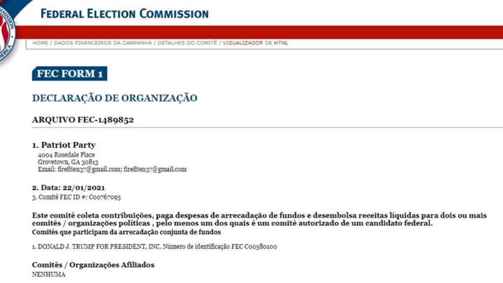 [caption id="attachment_92539" align="alignnone" width="1024"] A análise do Escritório de Patentes e Marcas dos EUA mostra que os direitos sobre o nome pertencem a outro indivíduo com sede na Flórida chamado Donald: Donald Magyar.[/caption] [caption id="attachment_92540" align="alignnone" width="1024"] documento já aparece no site da Comissão Eleitoral Federal. A política americana é classificada como “bipartidária”, ou seja, consiste nos partidos Republicano e Democrata.[/caption]