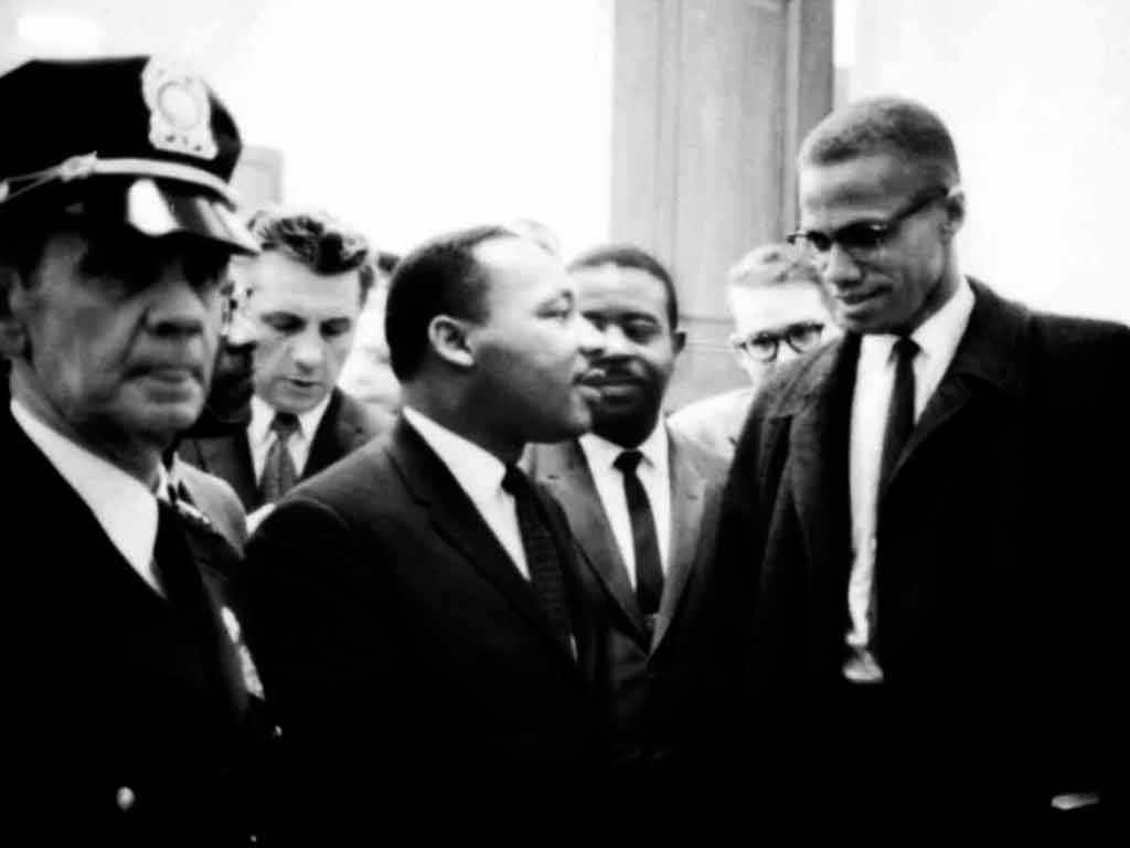 Malcolm Little, depois rebatizado com o nome islâmico Al Hajj Malik Al-Shabazz e conhecido como Malcolm X (D), foi um dos principais símbolos da luta pelos direitos civis nos Estados Unidos e pelo fim do preconceito racial, ao lado de Martin Luther King Jr (C).