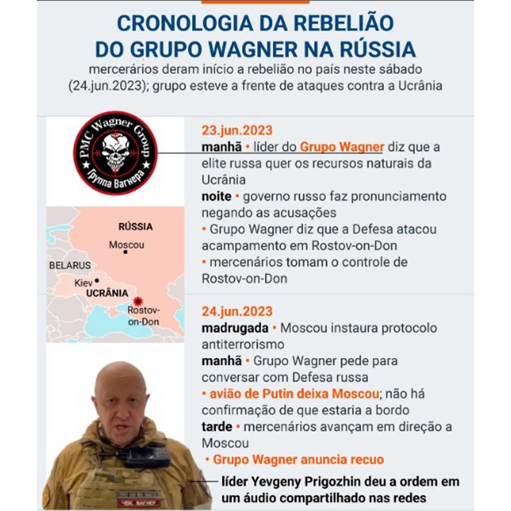 O Grupo Wagner iniciou, em 23 de junho, uma rebelião. Na ocasião, Yevgeny Prigozhin afirmou em um vídeo publicado que o ministro da Defesa da Rússia, Sergei Shoigu, estava enganando o presidente Vladimir Putin e a população do país.