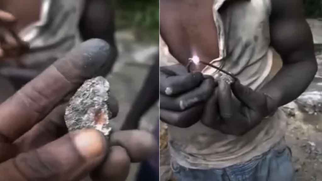 Um vídeo viralizou nas redes sociais mostrando dois homens manuseando uma rocha de aparência metálica na República Democrática do Congo.