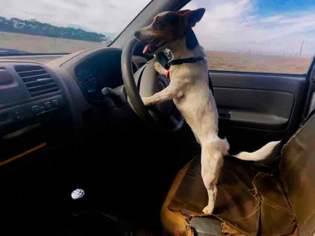 Nas cenas que chamaram a atenção, vemos a cadelinha com duas de suas patas ao volante, em pé no banco do motorista e tentando enxergar melhor a pista à frente.