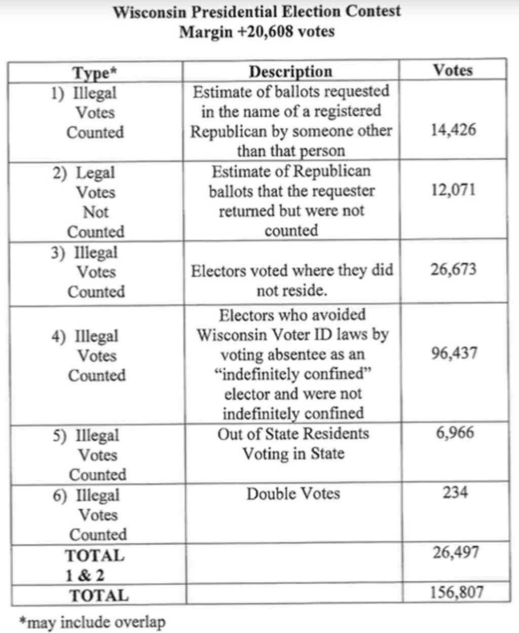 “Identificamos mais de 150 mil cédulas potencialmente fraudulentas em Wisconsin, mais do que o suficiente para questionar a validade dos resultados eleitorais informados pelo estado”,