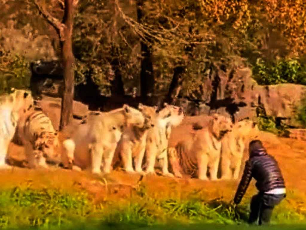 Um turista um tanto maluco resolveu que era uma boa ideia sair da área de segurança de um parque de vida selvagem e confrontar 11 tigres.