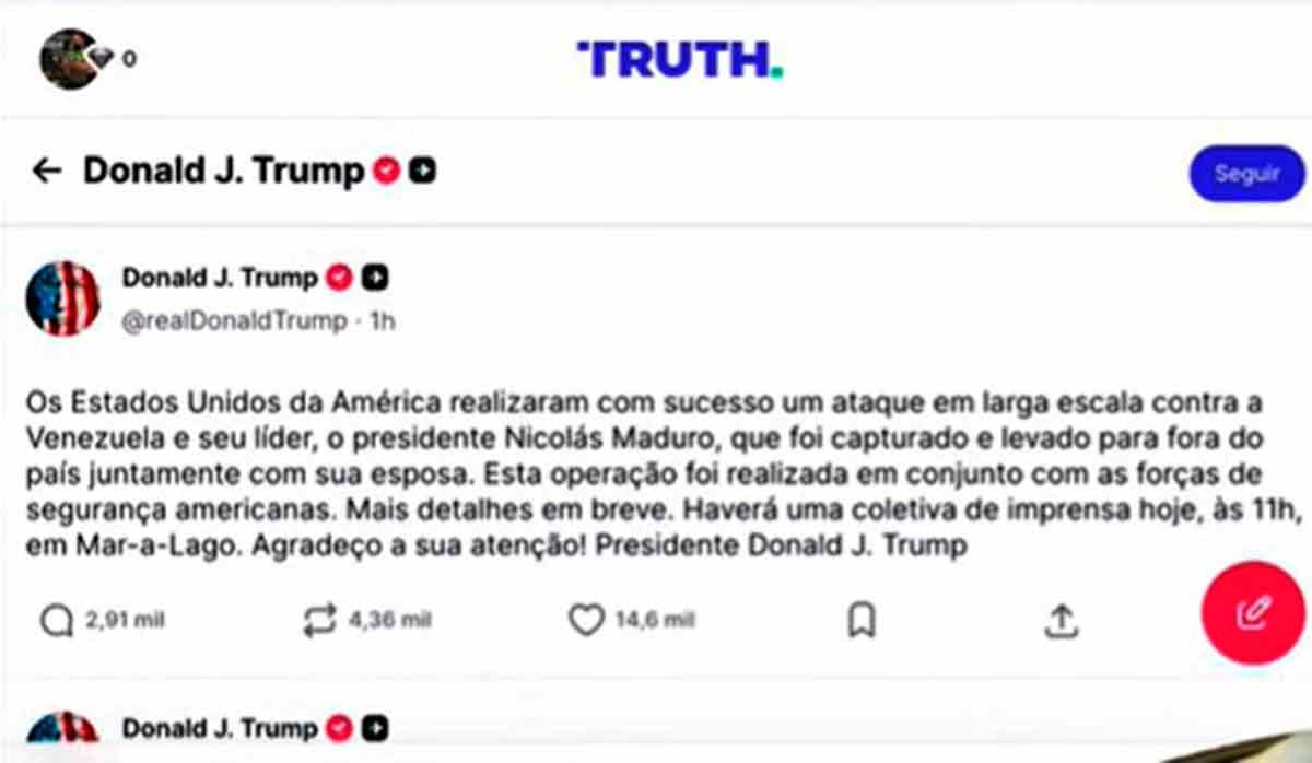 Segundo mensagens atribuídas ao presidente;em sua rede social, forças americanas teriam conduzido uma operação de grande escala na Venezuela, com sobrevoos noturnos e explosões relatadas em Caracas e regiões estratégicas.