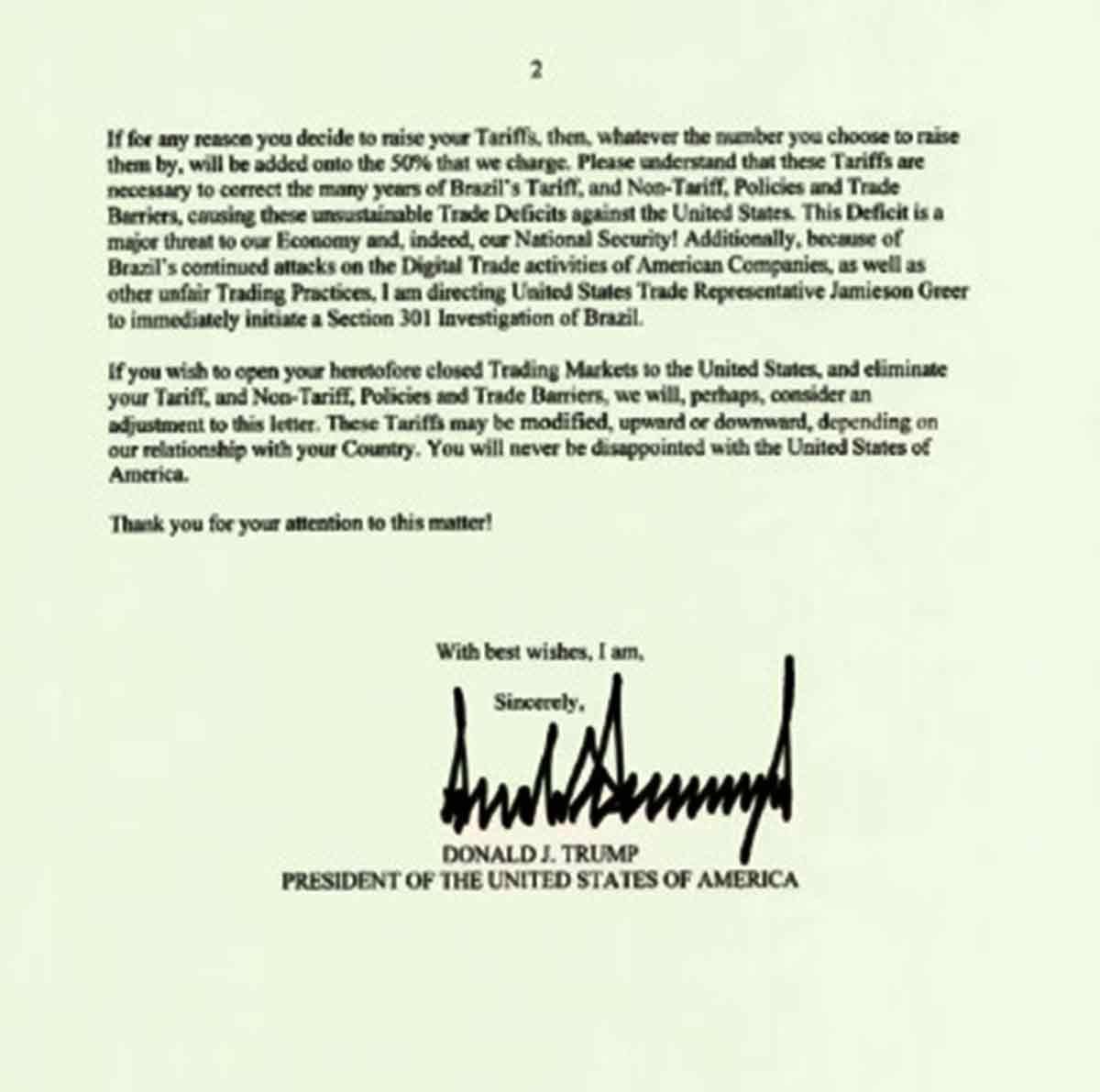 No mesmo documento, Trump anuncia a elevação da tarifa sobre o Brasil.