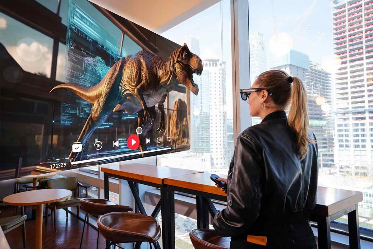 Os óculos do INAIR projetam uma tela virtual de 134 polegadas, invisível para quem está ao redor, com qualidade de cinema.