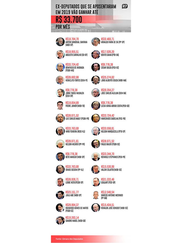 Ex-Deputados que se aposentaram em 2019 e vão ganhar ate R$ 33.700 mensal. Ludymila Silva/Arte R7[/caption]