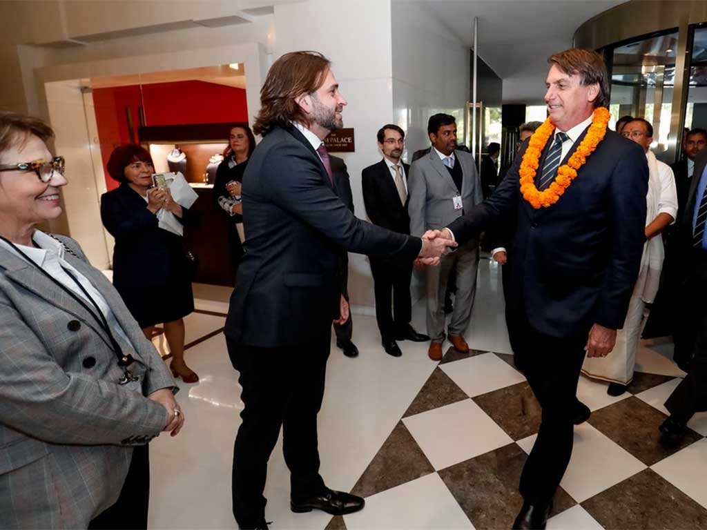 O presidente Jair Bolsonar cumprimenta o ministro-chefe da Casa Civil em exercício, Vicente Santini, ao chegar em Nova Delhi na Índia — Foto: Divulgação/ Presidência da República/Alan Santos[/caption]