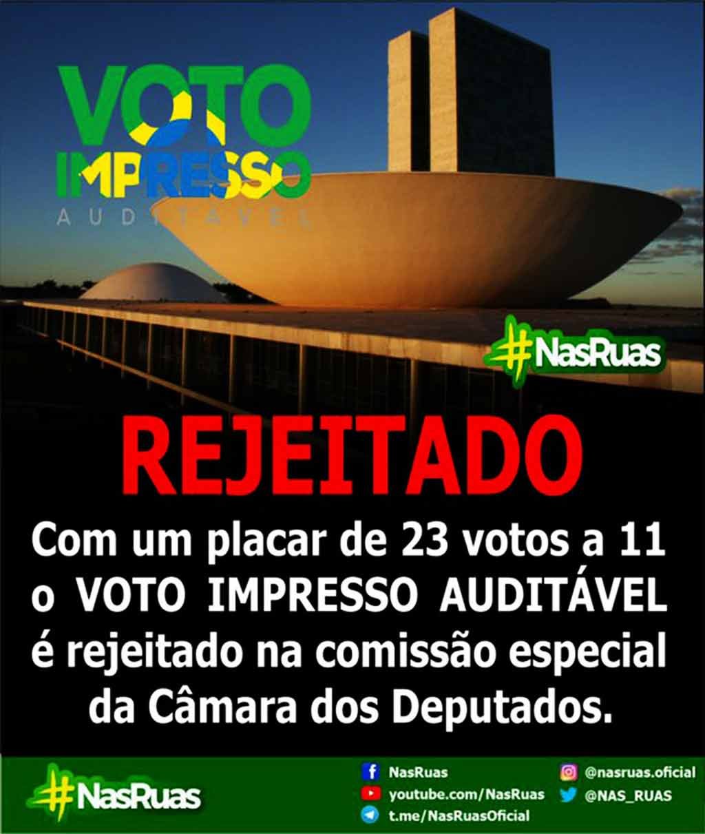 voto impresso obrigatório, rejeitou, nesta quinta-feira (5/8), por 23 votos a 11, o parecer do relator, deputado Filipe
