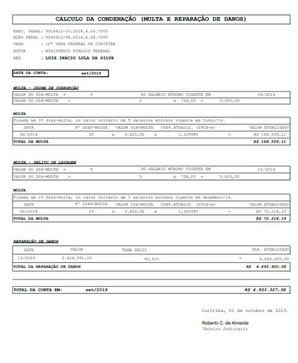 O valor da multa corresponde ao crime de corrupção, ou seja, a suposta aquisição do Triplex e suas reformas, no valor de R$ 2,2 milhões, em 2009, mais 35 dias multa no valor unitário de cinco salários mínimos. As cifras atualizadas e corrigidas com os juros chegam à soma de R$ 4,9 milhões.