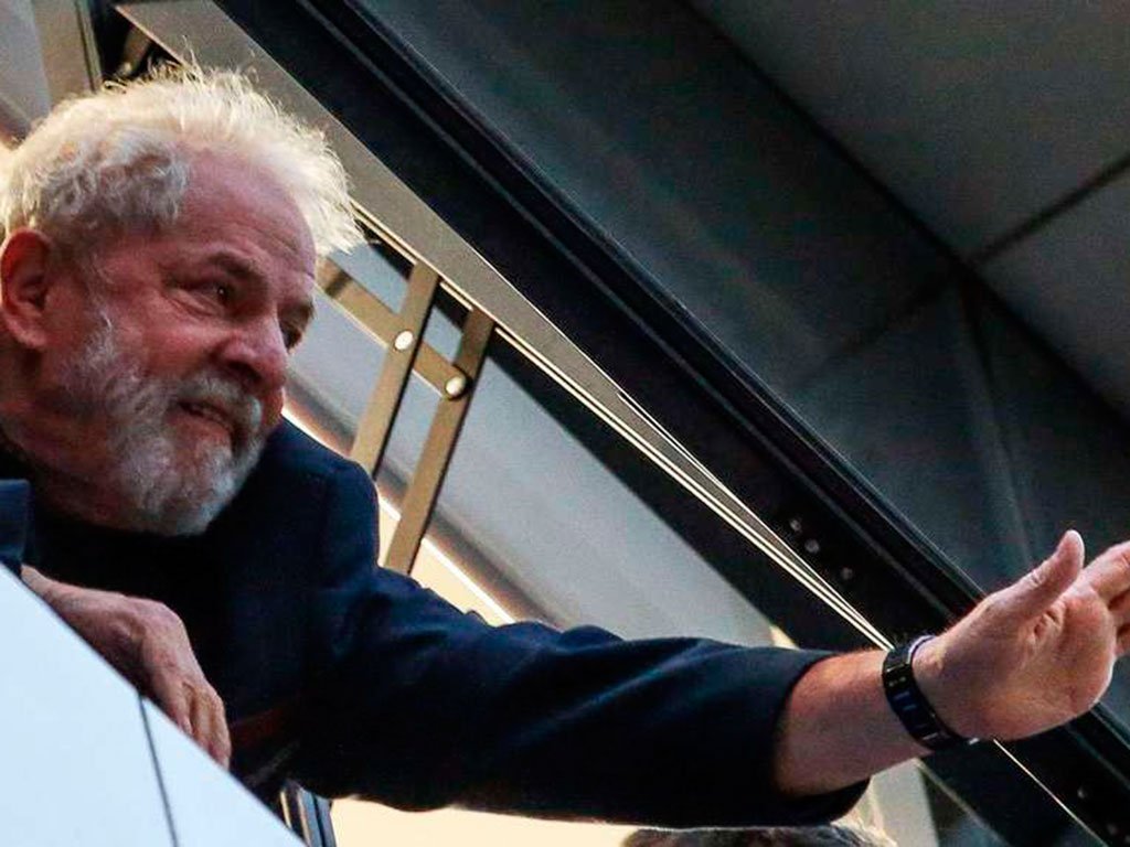 O ex-presidente Luiz Inácio Lula da Silva aparece na janela da sede do Sindicato dos Metalúrgicos do ABC, em São Bernardo, antes de ser