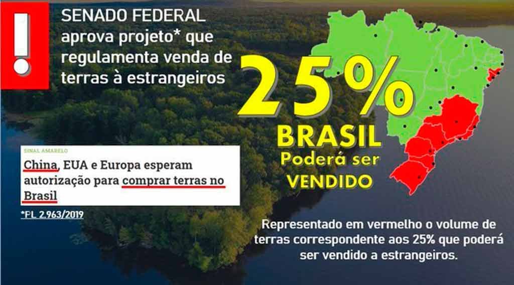 O Senado aprovou hoje (15) o Projeto de Lei (PL) 2.963/19, que permite a compra de terras rurais por estrangeiros, tanto para pessoas físicas quanto jurídicas. O projeto limita essa aquisição em até 25% do território do município. O projeto segue para a Câmara.