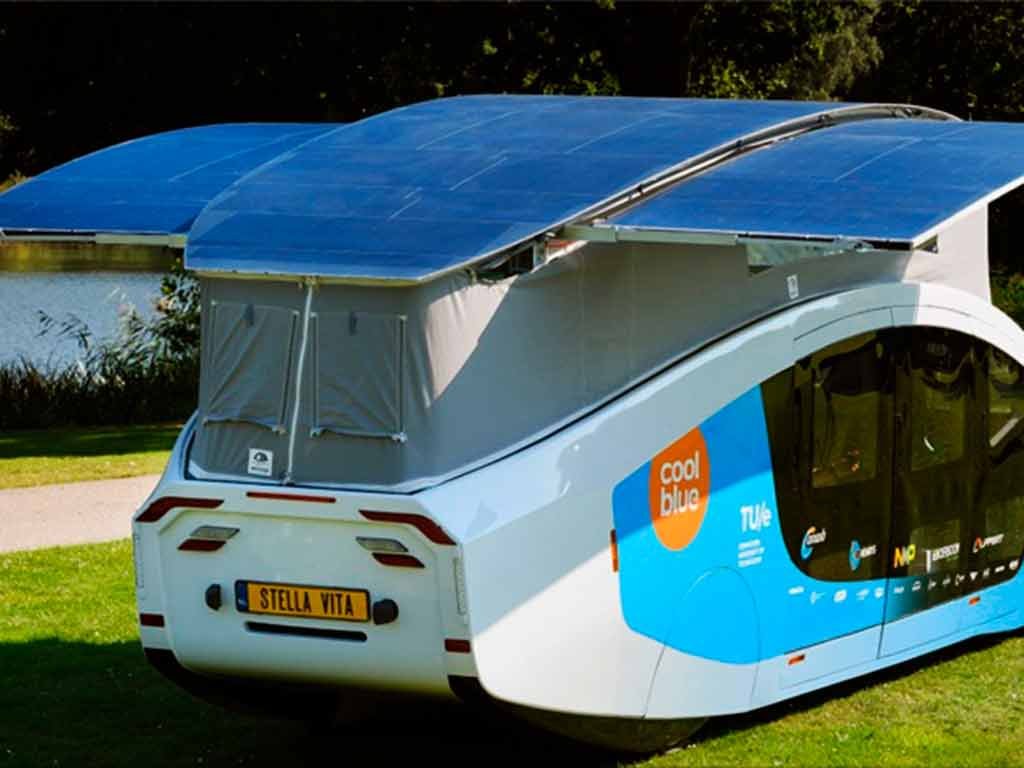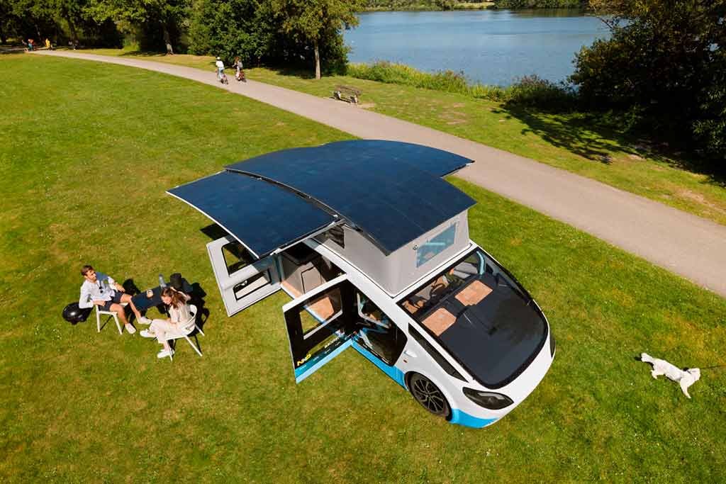 O veículo possui painéis solares no teto que podem ser expandidos em uma cobertura solar ao ser estacionado.