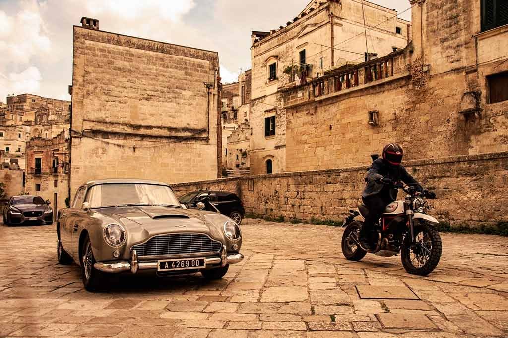 O clássico Aston Martin DB3 está de volta enquanto James Bond persegue os vilões nas ruas de Matera, na Itália, em ‘007 – Sem Tempo Para Morrer’. Imagem: Jasin Boland/MGM