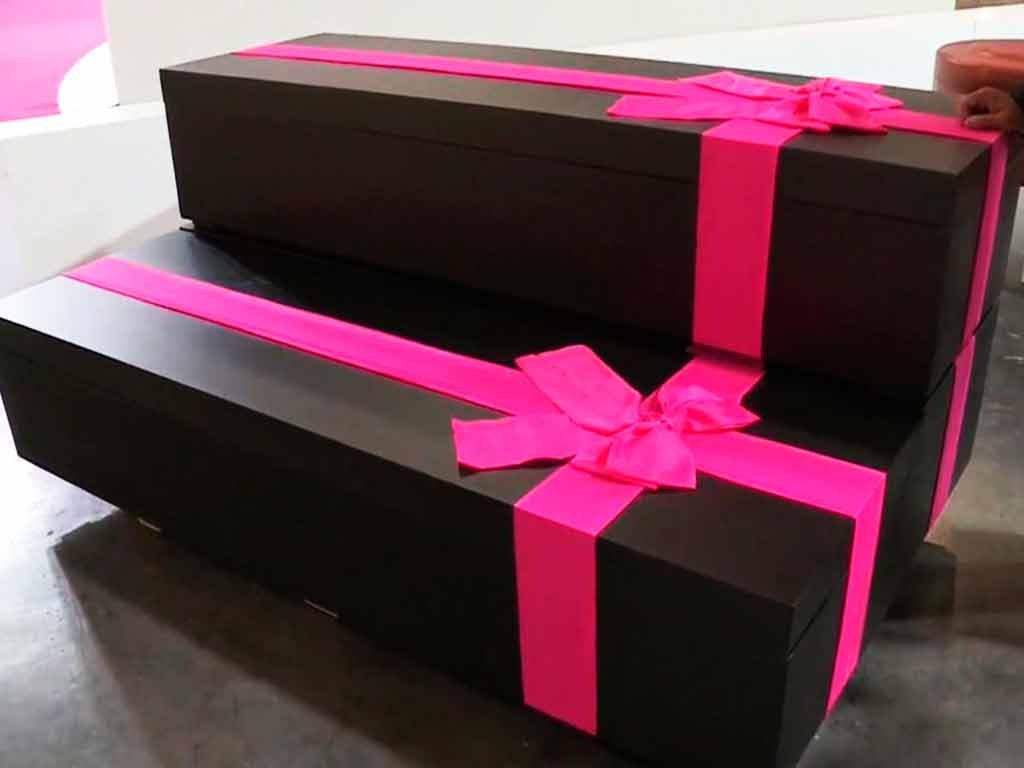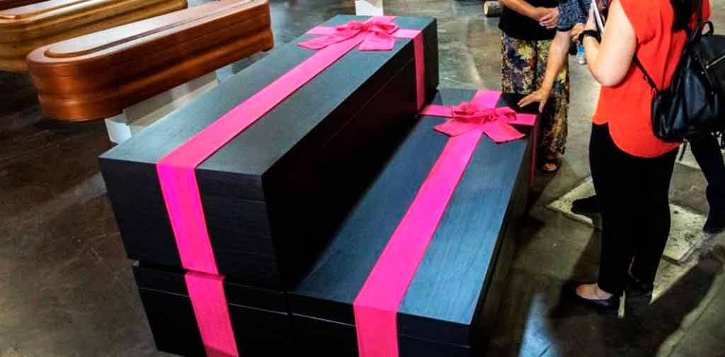 O novo modelo de caixão preto e com um enorme laço rosa se assemelha a um embrulho de presente. O produto foi lançado durante a 16ª edição da Funermostra, feira especializada do setor funerário, em Valência, na Espanha.