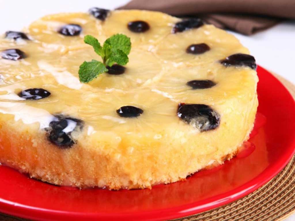 6 Coloque delicadamente na fôrma reservada, sobre o abacaxi, junto com as ameixas, e leve ao forno por 40 minutos ou até que um palito, depois de espetado na massa, saia limpo.