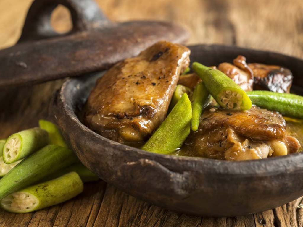 4 Volte o frango e o caldo coado para a panela e junte o quiabo. Não mexa e deixe cozinhar com a panela tampada por 8 minutos.