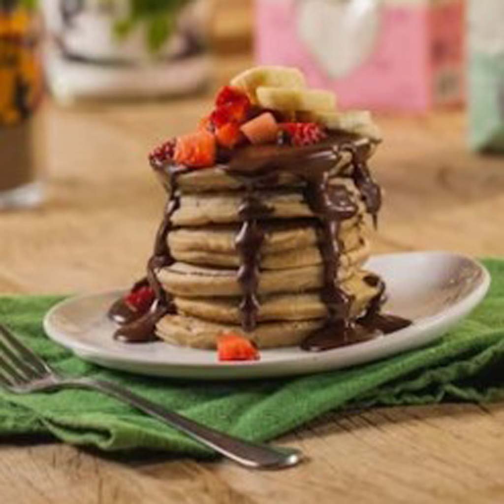 1 Coloque as panquecas empilhadas uma sobre as outras, ou sirva uma a uma, como preferir. Despeje o chocolate vegano já derretido sobre as panquecas e coloque as frutas por cima.