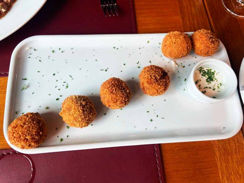 O menu começa pela safra de entradinhas – croquete de cupim com aioli; polenta com ovo e azeite trufado; torradinha gratinada com Roquefort; pastel de carne e queijo e polenta com ovo e azeite trufado