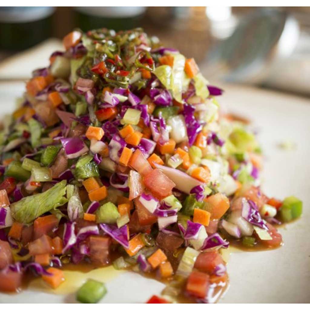 Uma mistura de legumes e verduras variados e um molho bem temperado resultam nesta bela salada rústica colorida.