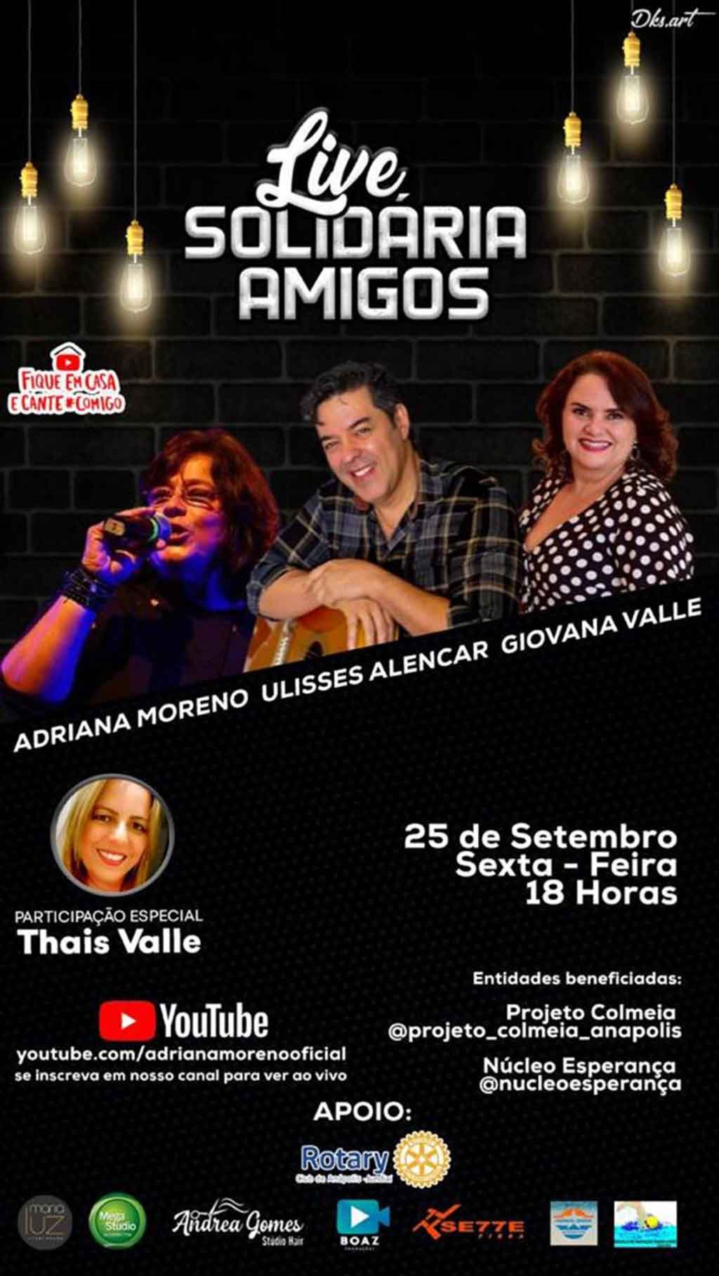 A Live Solidária Amigos, será estrelada pelos cantores anapolinos Adriana Moreno ,Giovana Valle e